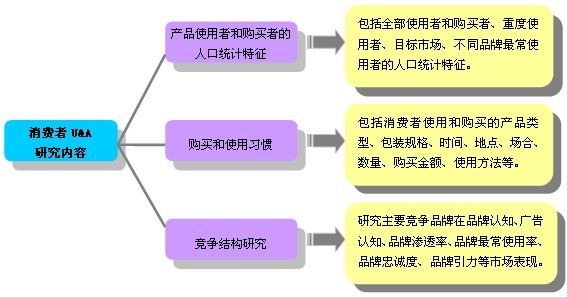 消費者U&A研究(Usage and Attitude Research)是指消費者使用習慣和態度研究,是針對某一種或某一類產品消費者的深入研究。通過 U&A 模型,企業可以準確的測量出被測產品的市場狀況、目標消費者狀況、競爭對手狀況,還可以有效的了解消費者特征和消費者行為,從而為企業下一步的市場策略或市場推廣提供指導性依據。
